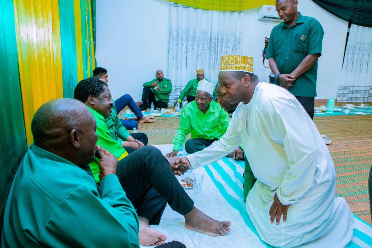 The Secretary General of the Chama Cha Mapinduzi (CCM), Ambassador Dr. Emmanuel John Nchimbi, greets some elders from different areas of the Pemba Districts, immediately after the Futar he organised for them in Chakechake today, Saturday 23 March 2024, where he had earlier met them for discussions and consultations on various issues in their areas and nationally.- 1