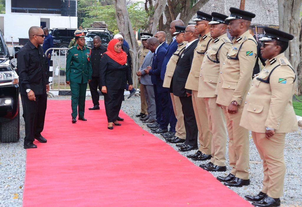 President of the United Republic of Tanzania and Commander-in-Chief Hon. Samia Suluhu Hassan greeting the Police Force Leaders immediately after arriving at the Police Officer's Mess Oyster bay in Dar es Salaam.- 1