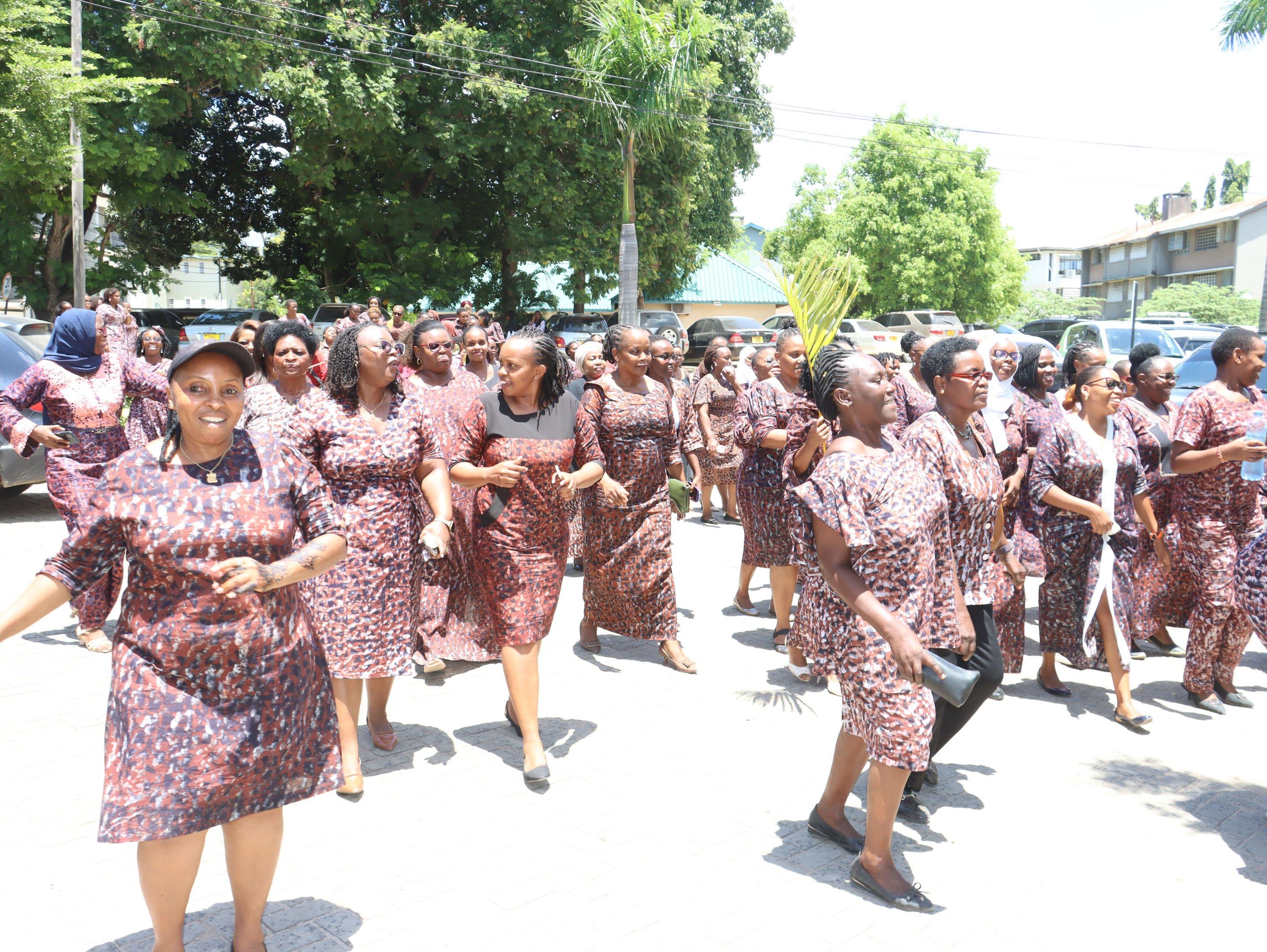 MUHAS women marching to Muhimbili University Lecture Hall 4 to celebrate International Women's Day. MUHAS women dancing happily at the International Women's Day celebration at MUHAS College.- 1